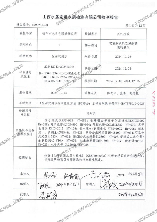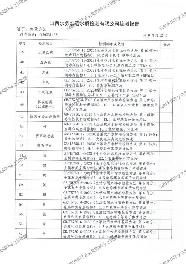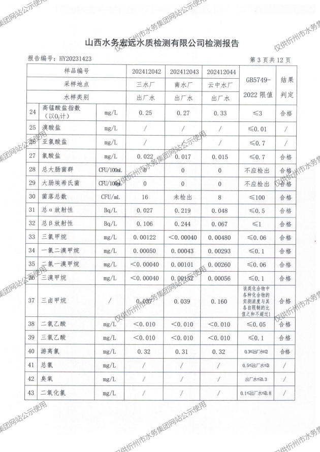 2024年忻州城區(qū)公共供水南水廠、三水廠、云中水廠出廠水97項水質(zhì)全分析