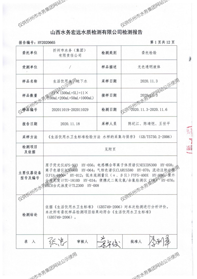 忻州城區(qū)公共供水水源水、出廠(chǎng)水、管網(wǎng)水、管網(wǎng)末梢水2020年11月份水質(zhì)信息公示